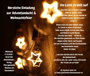 Was für eine wunderbare Einstimmung auf Weihnachten durften wir in Neuhaus erleben! Im weihnachtlich geschmückten Gemeindesaal feierte Lektor Peter Kerschbaumer mit uns eine Adventandacht, weihnachtliche Lieder wurden gesungen und danach saßen wir in gemütlicher, freundschaftlicher Runde bei Tee und köstlichen Weihnachtsbäckereien zusammen und tauschten uns aus. Über Gott und die Welt! Danke allen, die beigetragen haben, diesen Abend so schön und stimmig zu gestalten – und natürlich allen Mitfeiernden!
