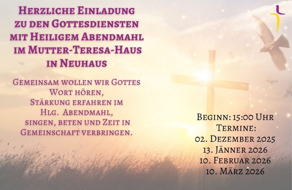 NÄCHSTER GOTTESDIENST: +++ Samstag, 03.01.2026 in der ARCHE in Jennersdorf. Achtung: Beginn bereits um 17:00 Uhr. +++ Gottesdienst in der Tochtergemeinde Minihof-Liebau am 11.01.2026 um 08:30 Uhr. +++ Am 11.01.2026 um 16:00 Uhr beginnt um 16:00 Uhr im Gemeindesaal in Neuhaus die Neujahrsandacht, gefolgt vom JAHRESRÜCKBLICK 2025 und einem Neujahrsempfang. +++