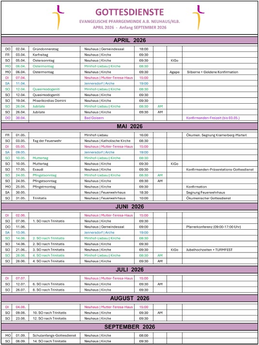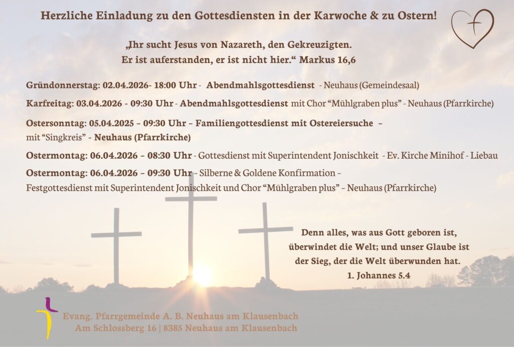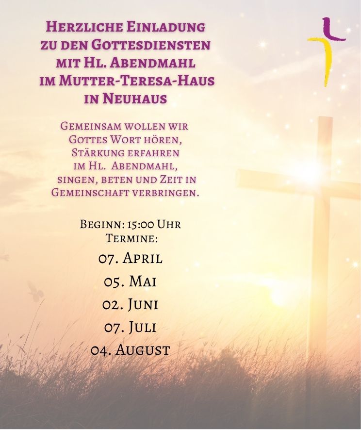 NÄCHSTE GOTTESDIENSTE: Am Sonntag Quasimodogeniti (12.04.2026) in MINIHOF-LIEBAU um 08:30 Uhr und in NEUHAUS (Beginn 09:30 Uhr)