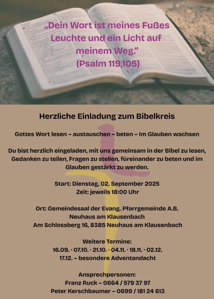 Alle zwei Wochen dienstags um 18:00 Uhr treffen wir uns im Neuhauser Kleinen Gemeindesaal im Obergeschoß und lesen in der Heiligen Schrift. Impulsgeber und Leiter des Bibelkreises ist unser Lektor Peter Kerschbaumer.