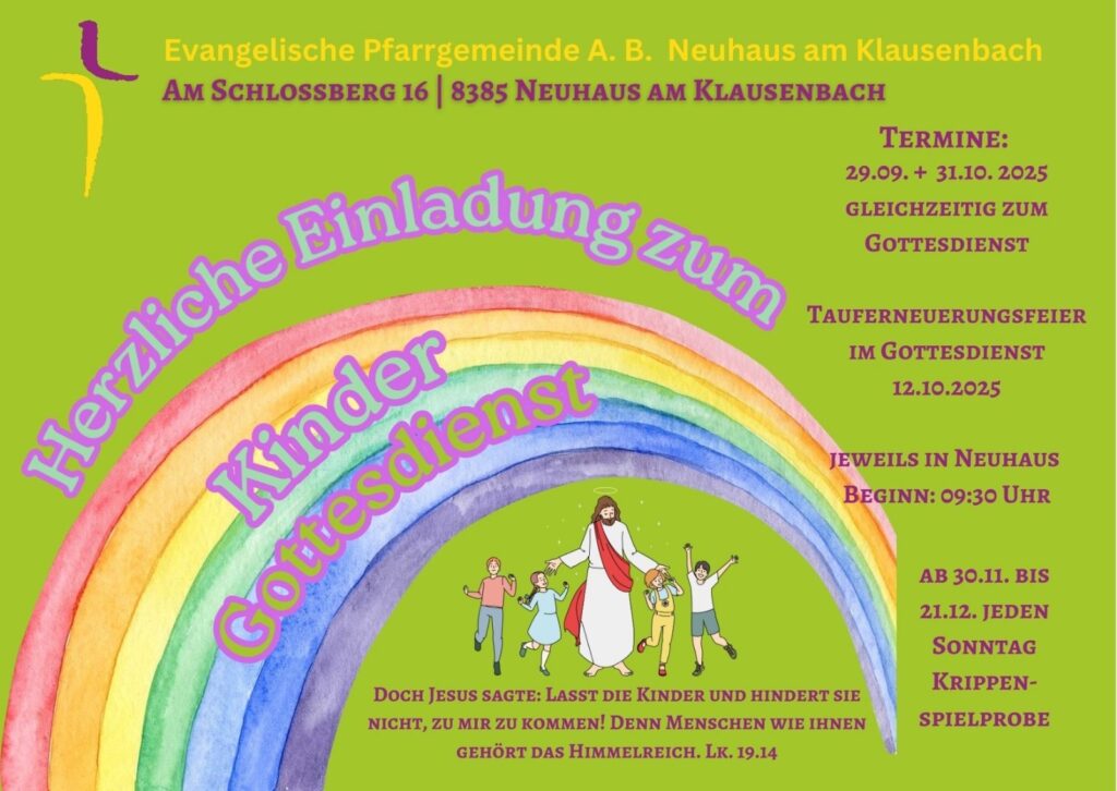 im Herbst…Die nächsten KINDERGOTTESDIENST-TERMINE sind 29.09.2025 und 31.10.2025 (Reformationstag). Den Tauferneuerungs-Gottesdienst feiern wir am 12.10.2025 (Taufkerze mitbringen!). Beginnend mit dem 30.11.2025 wird bis 21.12.2025 jeden Sonntag ab 09:30 Uhr für das Krippenspiel am 24.12.2025 geprobt.