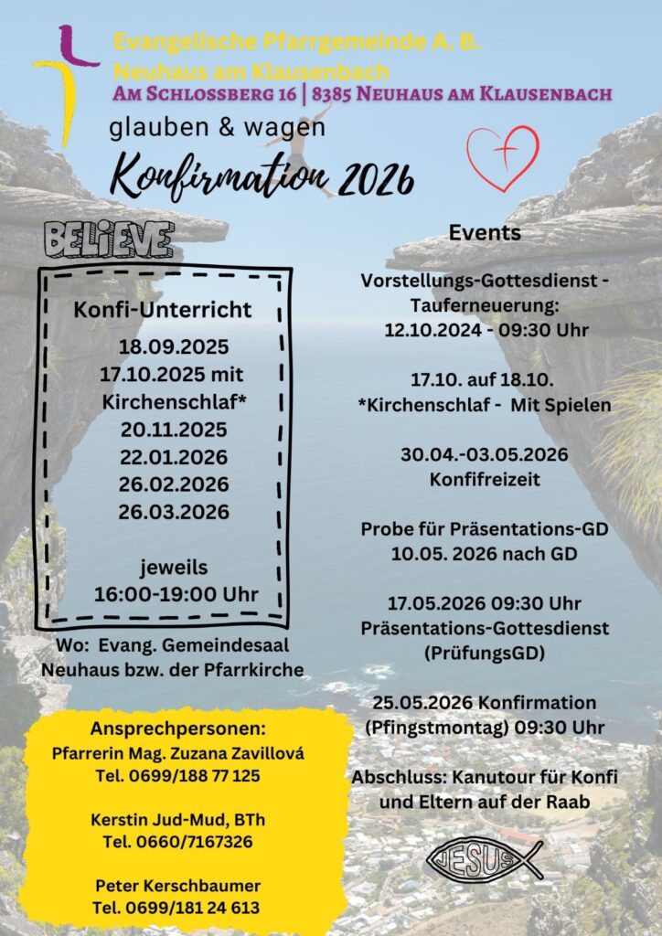 Einmal im Monat donnerstags treffen sich die KonfirmandInnen mit den Leitern der Konfirmandenarbeit – den Lektoren Peter KERSCHBAUMER und Kerstin JUD-MUND, BTh. Der „Fahrplan“ bis zur Konfirmation am Pfingstmontag 2026 steht fest – siehe oben!